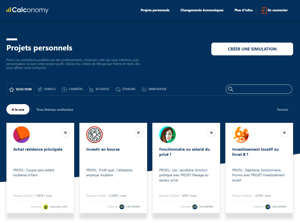Une fois que son « Profil » est défini, la simulation d’un « Projets personnel » ou d’un « Changement économique » se fait en un clic, en personnalisant une simulation publiée.