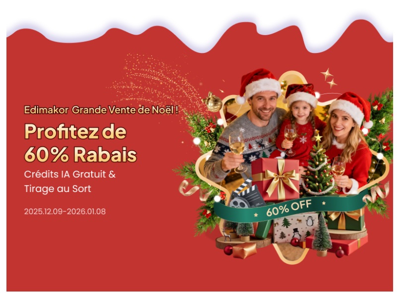 Edimakor lance sa campagne spéciale Noël 2025, du 9 décembre 2025 au 8 janvier 2026, avec jusqu’à 60% de réduction sur les formules permanentes et des crédits IA offerts, une occasion unique pour tous les créateurs vidéo, débutants ou professionnels.