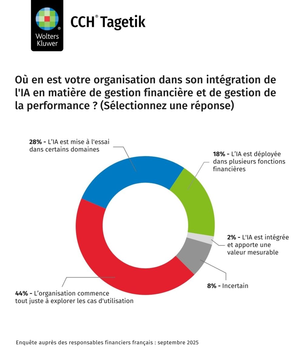 PARIS – 24 septembre 2025 - Wolters Kluwer, leader mondial de l’information professionnelle, des solutions logicielles et des services, a publié aujourd’hui les résultats d’une nouvelle enquête révélant que les directions financières en France adoptent de plus en plus l’intelligence artificielle (IA) dans la gestion financière et le pilotage de la performance. Bien que de nombreux répondants indiquent être encore au stade initial de l’adoption, les résultats reflètent une reconnaissance croissante du potentiel de l’IA à générer un impact mesurable sur les processus financiers clés.